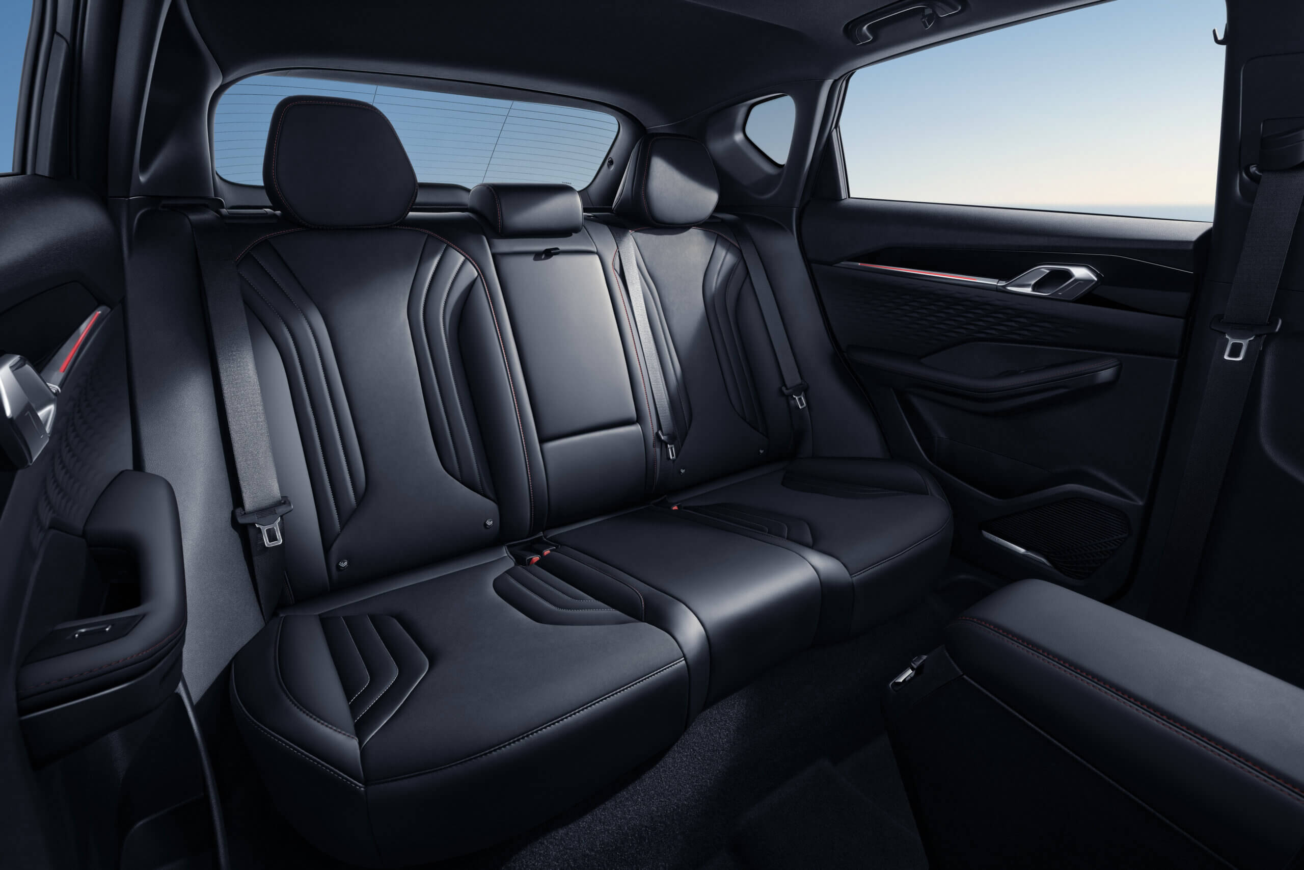 En la parte trasera,New Coolray ofrece amplio espacio para los pasajeros, pensado para viajes cómodos y relajados. Los asientos están tapizados en cuero, con un diseño elegante y detalles premium. Incluyen apoyabrazos central con posavasos y luz de ambiente, que aportan confort y una sensación más sofisticada.