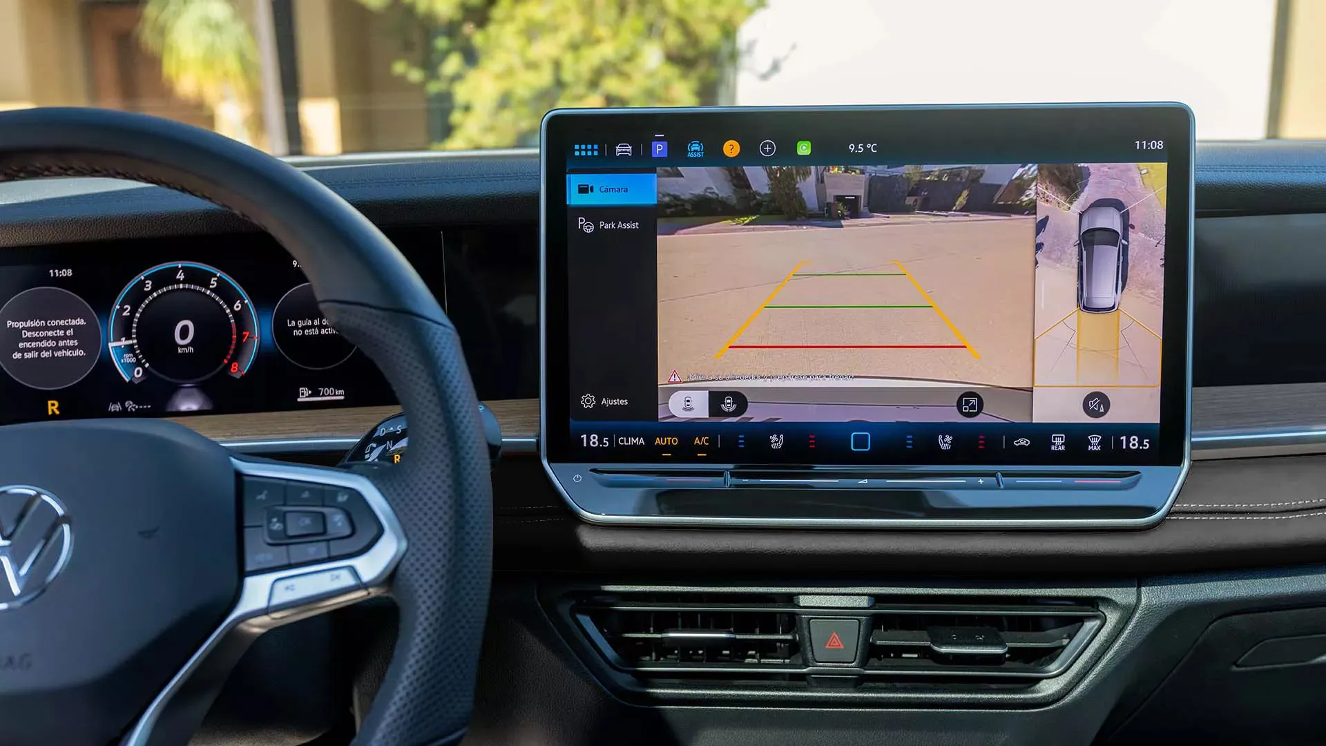 Desde R-Line, el Sunroof Panorámico ofrece amplitud, luminosidad natural y vistas ininterrumpidas. Los insertos en madera suman calidez, distinción y un toque artesanal al interior, mientras que el panel frontal en cuero con costuras blancas realza la calidad y el diseño en cada superficie.